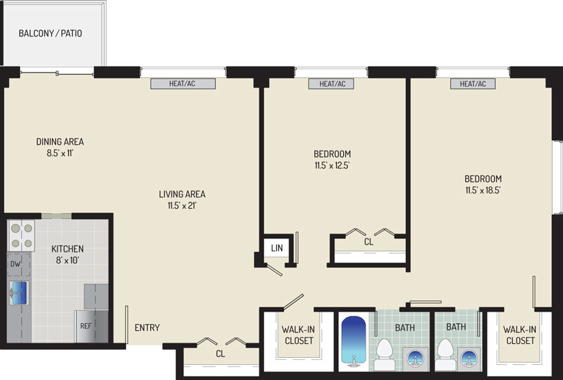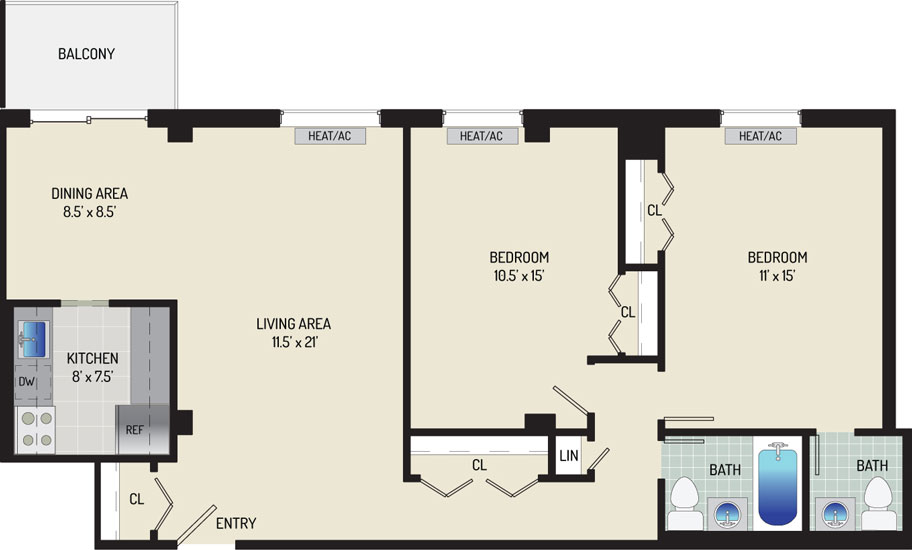 2 Bedrooms + 1 Bath